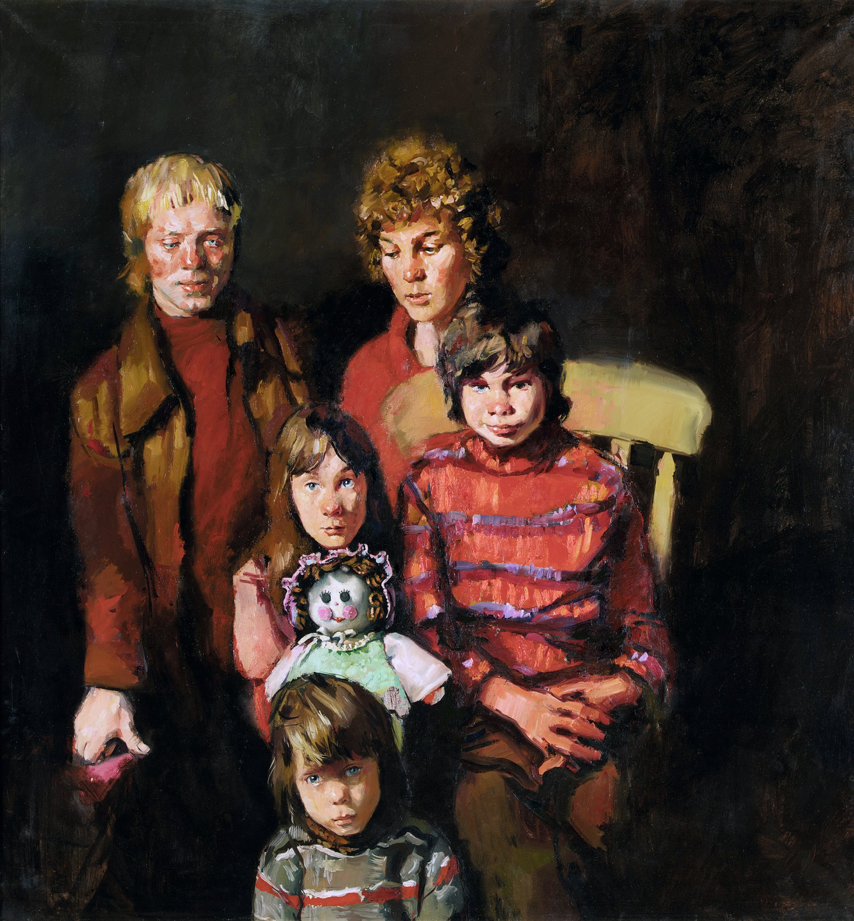 In his contribution to the survey, Lenkiewicz’s life-long friend Hans de Rijke, a physiotherapist who worked with some of the families who participated in the Project, remarked that "a child-like mind does not question its reason for living, it makes no self-judgement". The Greep children meet the viewer’s gaze directly, unselfconsciously, but the parents, their eyes averted, are the ones who seem to bear the burden of being viewed as outcasts. In Lenkiewicz’s view part of the ‘tragedy’ was that "a handicapped child means a handicapped parent."