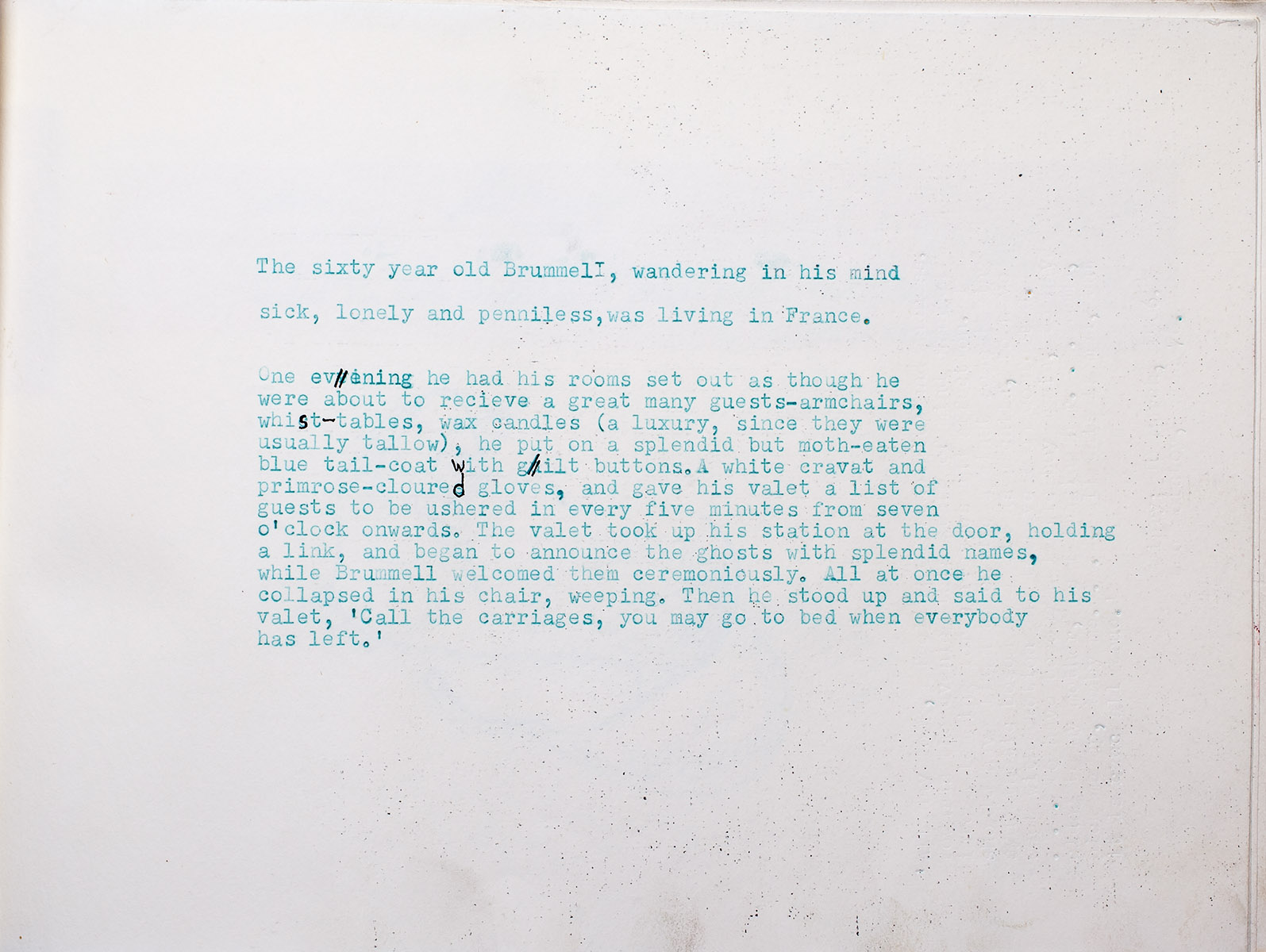 One evening he had his rooms set out as though he were about to receive a great many guests – armchairs, whist-tables, wax candles (a luxury, since they were usually tallow), he put on a splendid but moth-eaten blue tail-coat with gilt buttons. A white cravat and primrose-coloured gloves, and gave his valet a list of guests to be ushered in every five minutes from seven o’clock onwards. The valet took up hi station at the door, holding a link [light?], and began to announce the ghosts with splendid names, while Brummell welcomed them ceremoniously. All at once he collapsed in his chair, weeping. Then he stood up and said to his valet, “Call the carriages, you may go to bed when everyone has left.”