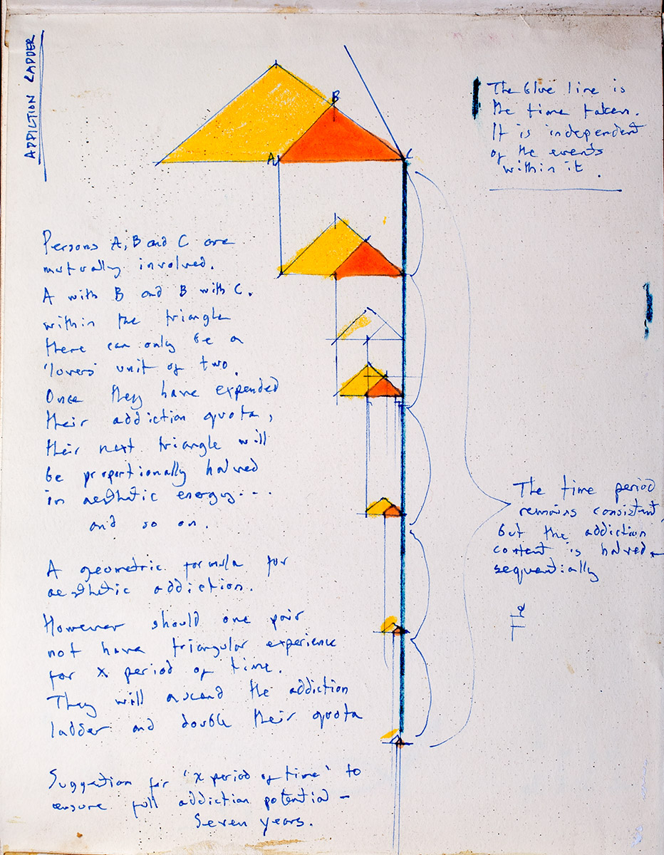 Persons A, B and C are mutually involved. A with B and B with C. Within the triangle there can only be a ‘lovers’ unit of two. Once they have expended their addiction quota, their next trainagle will be proportionately halved in aesthetic energy… and so on.