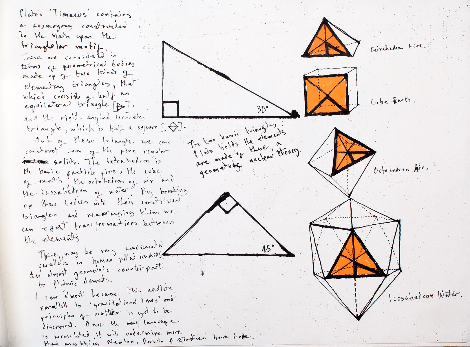 Out of these triangles we can construct four out of the five regular solids. The tetrahedron is the basic particle fire, the cube of earth, the octahedron of air and the icosahedron of water. By breaking up these bodies into their constituent triangles and rearranging them we can effect transformations between the elements.
