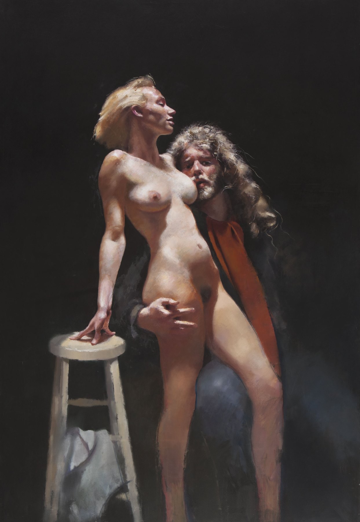 It also inspired photographer Dr Philip Stokes, who had long enjoyed privileged access to the painter’s studio as he worked on a pictorial biography of the artist – he came to one of the early sittings for this painting and photographed artist with model. The high tones of the model’s skin under a powerful top-light proved technically challenging for the photographer. Stokes recorded that: “The pose was not wildly contorted, indeed seemed almost restful, but Samantha assured me it was most difficult to hold, especially in view of the load on her right arm, and frequent rests were needed.”